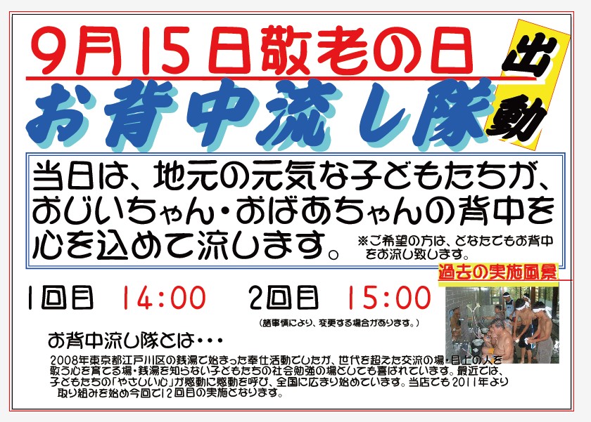 お背中流し隊出動!! 本日(9/15(月))敬老の日に、古賀(地元)の子供達が目上の人に対して、敬う気持ちや、労いの気持ちを込めて✨おじいちゃんや👴おばあちゃん👩🦳のお背中を流しに来てくれます😆✨ ぜひ、この機会にお越し下さい!!